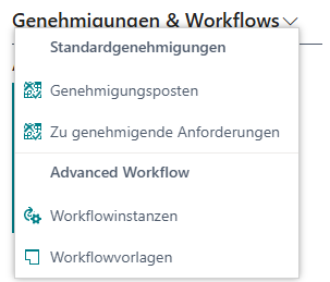 Wenn Ihre Rolle/Startseite einen Einstieg bietet, finden Sie häufig auf „Genehmigungen & Workflows“ den Bereich „Advanced Workflow“ mit Links zu: