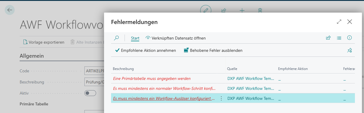 Wenn Sie die Vorlage aktivieren, führt die App eine Validierung aus und zeigt ggf. eine Fehlerliste an.