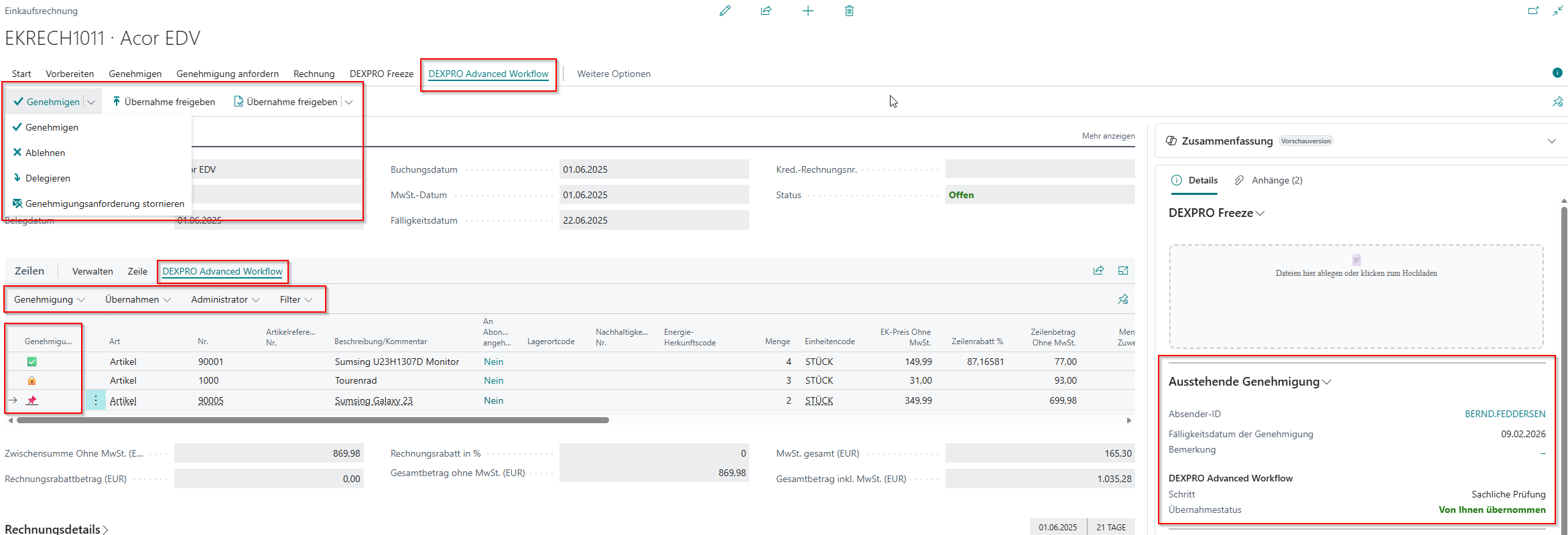 Wichtig: Vor dem Genehmigen/Ablehnen/Delegieren wählen Sie zunächst „Genehmigung übernehmen“, damit Sie exklusiv am Vorgang arbeiten können.