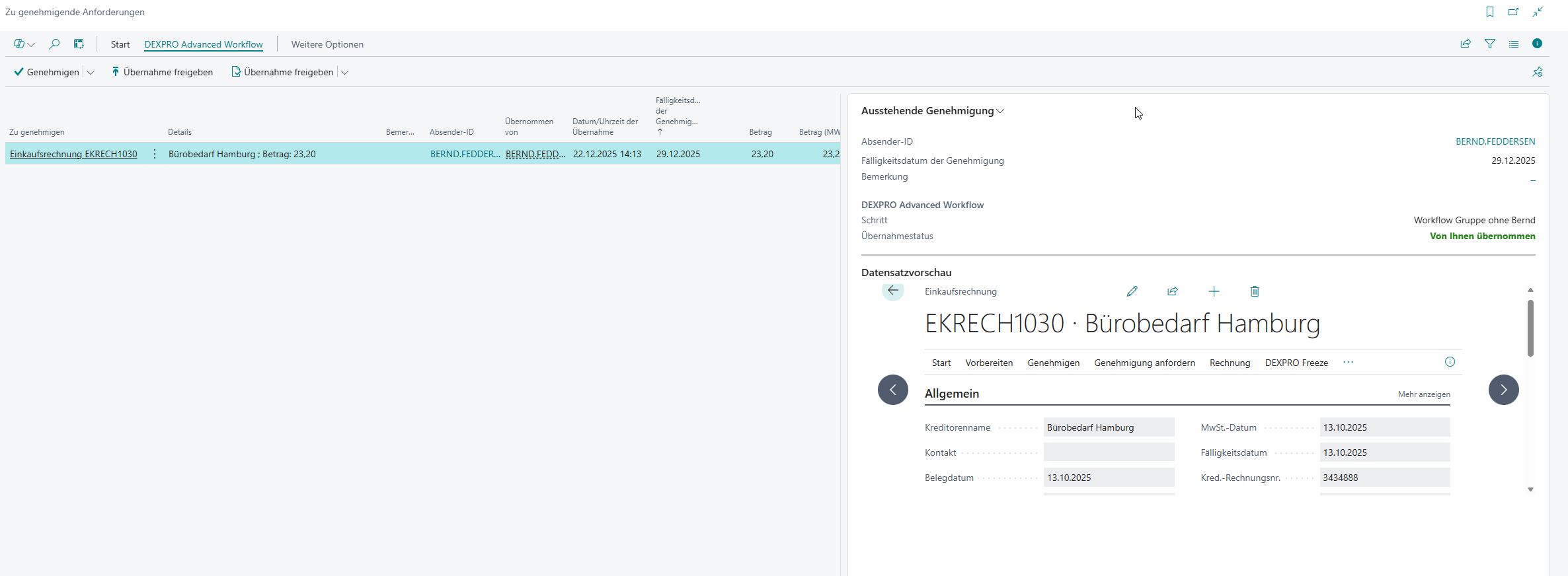 Wichtig: Vor dem Genehmigen/Ablehnen/Delegieren wählen Sie zunächst „Genehmigung übernehmen“, damit Sie exklusiv am Vorgang arbeiten können.