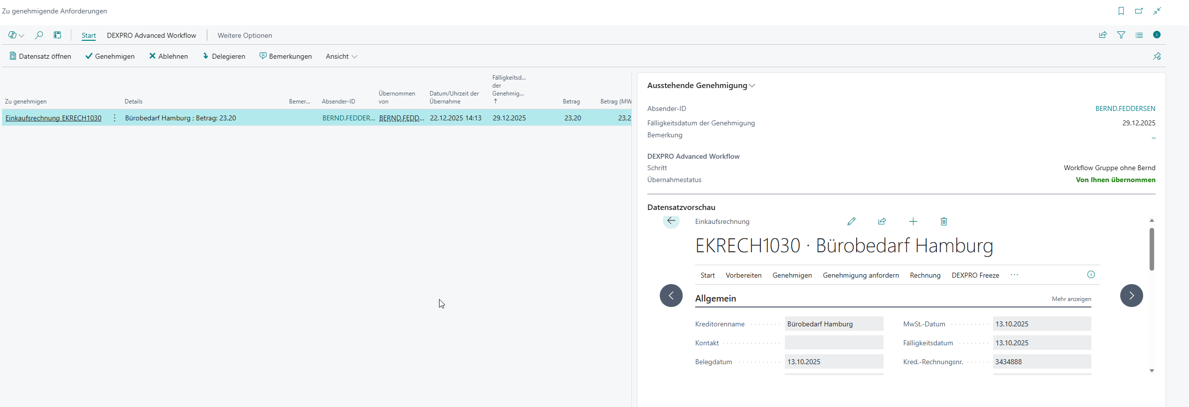 Wichtig: Vor dem Genehmigen/Ablehnen/Delegieren wählen Sie zunächst „Genehmigung übernehmen“, damit Sie exklusiv am Vorgang arbeiten können.