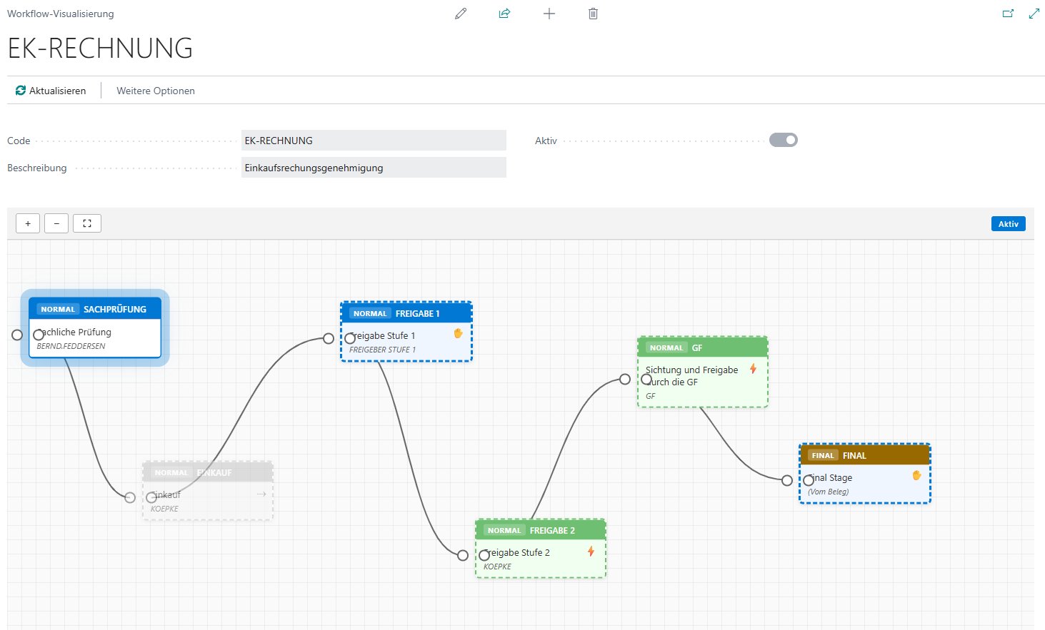 Die Workflow-Visualisierung zeigt eine interaktive grafische Darstellung der Workflowvorlage mit allen Schritten und Verbindungen.
