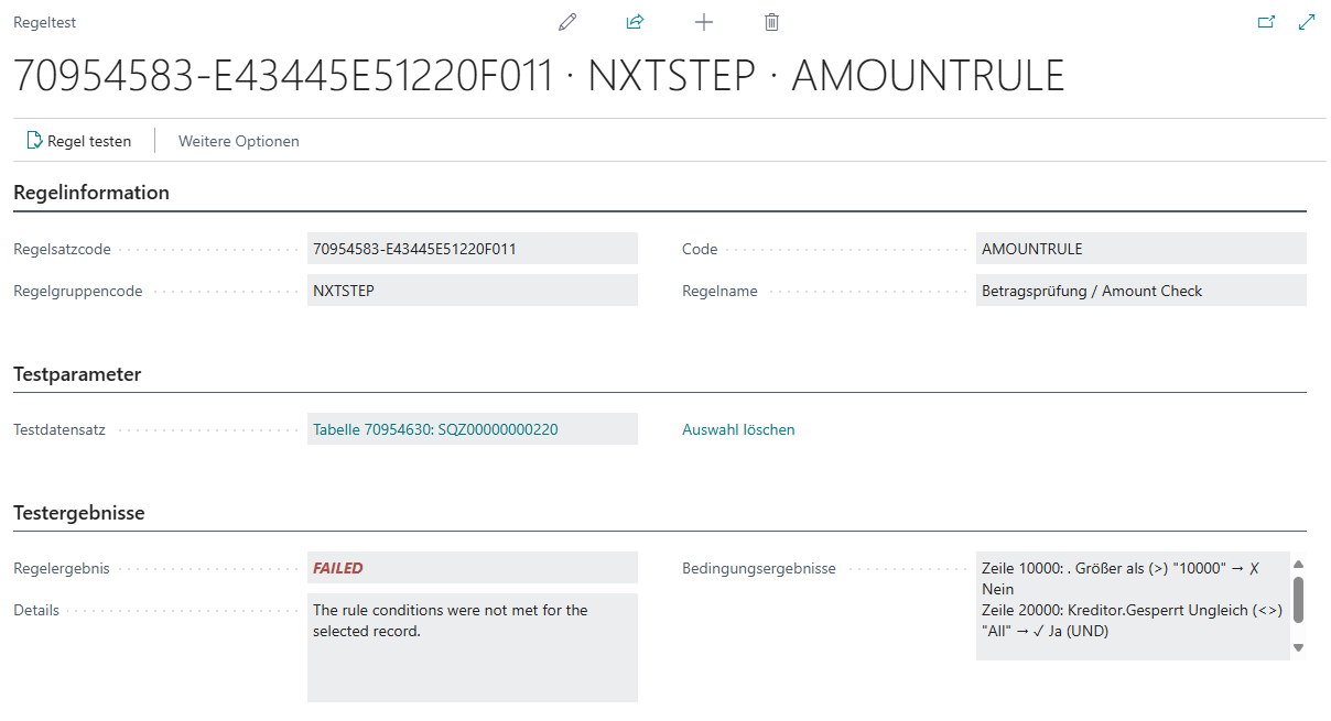 Sie wählen den Testdatensatz aus und klicken auf "Regel testen". Im Anschluss wird Ihnen dann das Resultat des Tests angezeigt. Auf der rechten Seite sieht man zusätzlich die Ergebnisse der einzelnen Regelbedingungen.