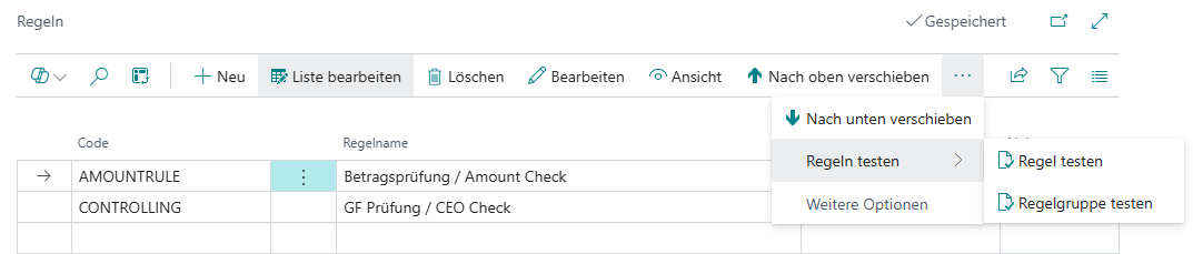 Here you will find the stored rules for each rule set and the order in which they are checked (priority). You can change the order at any time via the menu. In addition, you can test both the rule group and individual rules using sample data records.