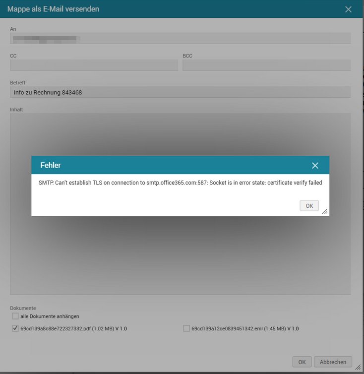 Documents: SMTP Can't establish TLS on connection to smtp.office365.com:587: Socket is in error state: certificate verify failed