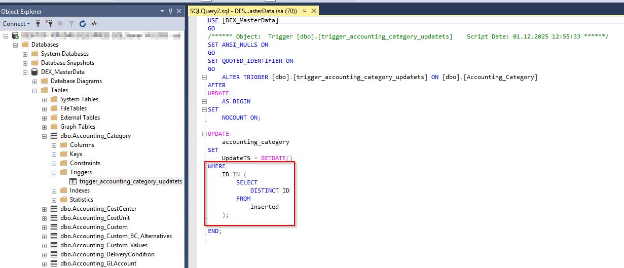 Alle Tabellen der DEX_MasterData und DEX_Workflow haben einen Trigger für die Tabellen-Spalte UpdateTS. Durch diesen Trigger wird bei jederem Update-Befehl der Spaltenwert aktualisiert. Hierdurch kann man bei Supportfällen schnell herausfinden, wann Datensätze zuletzt geändert wurden.