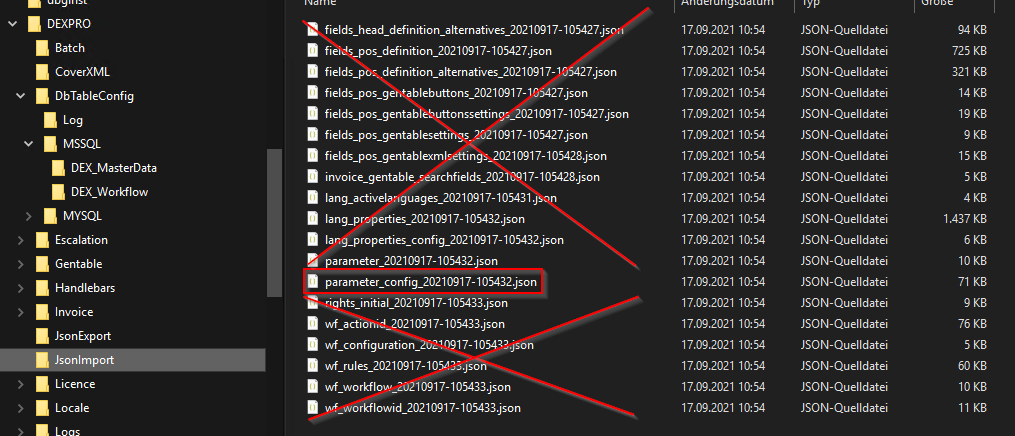 Im DEXPRO-Ordner unter "JsonImport" liegen die neuen Standard-Konfigurationen zur neuen Invoice-Version. Bei fast allen Konfigurationen würde ein erneuter Import projektspezifische Anpassungen überschreiben. Aus diesem Grund sollten alle Dateien aus dem Ordner abgesehen von der "parameter_config*.json" gelöscht werden, damit diese Dateien garantiert nicht erneut importiert werden.