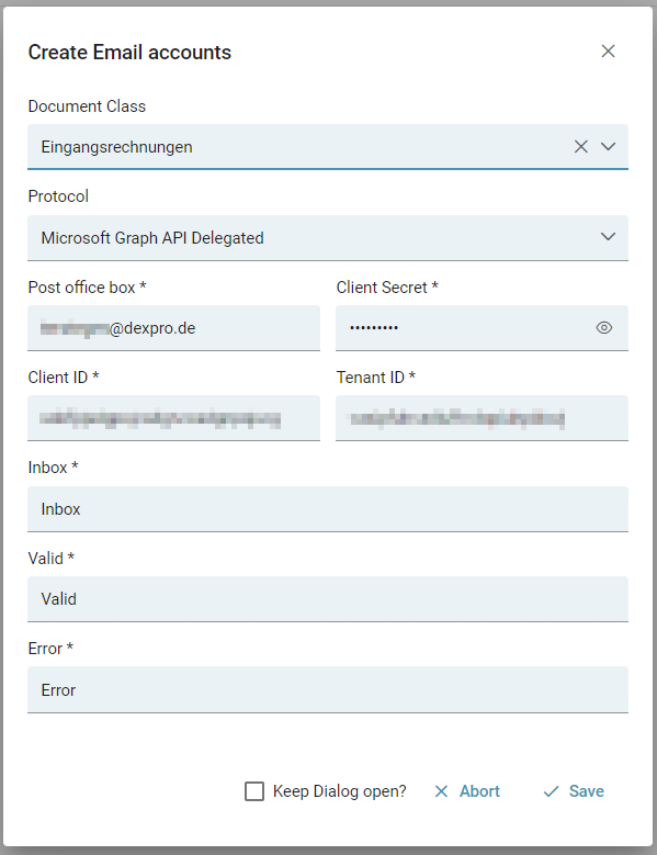 with a Client Secret. The global registration of a mail service of "Dexpro" in the Azure Active Directory of the customer is not offered for the time being.
