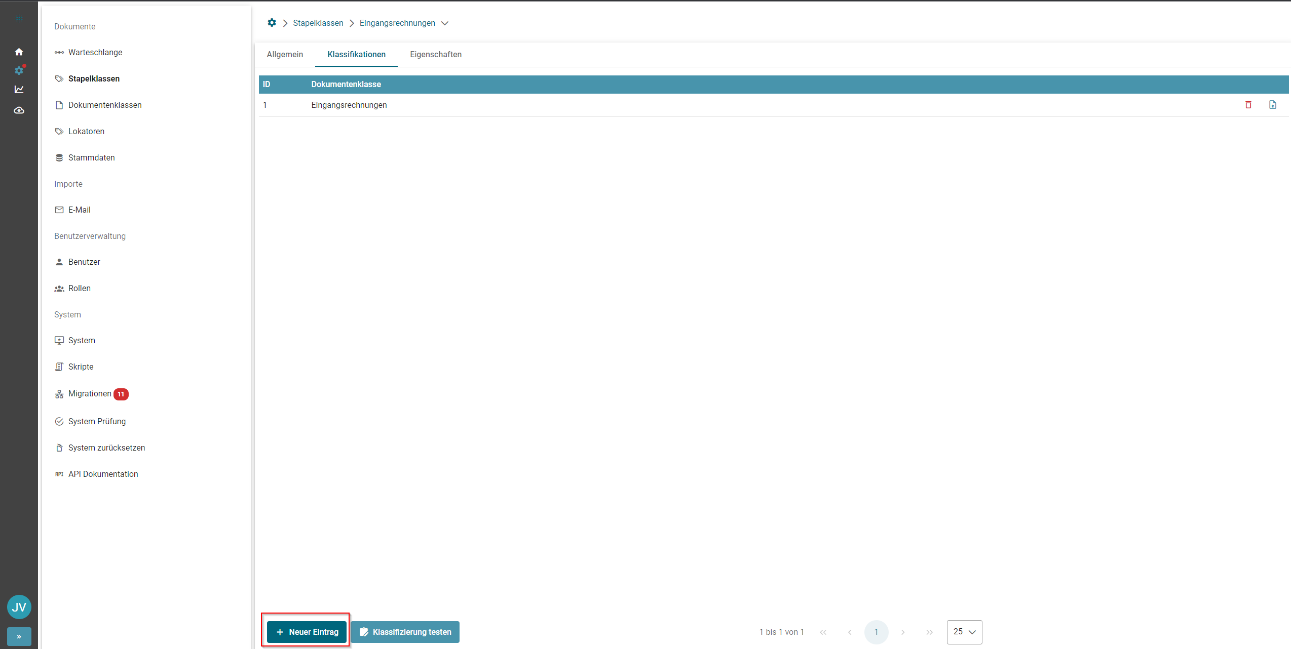 Mit einem Klick auf "Neuer Eintrag" können der Stapelklasse Dokumentenklassen zugeordnet werden.