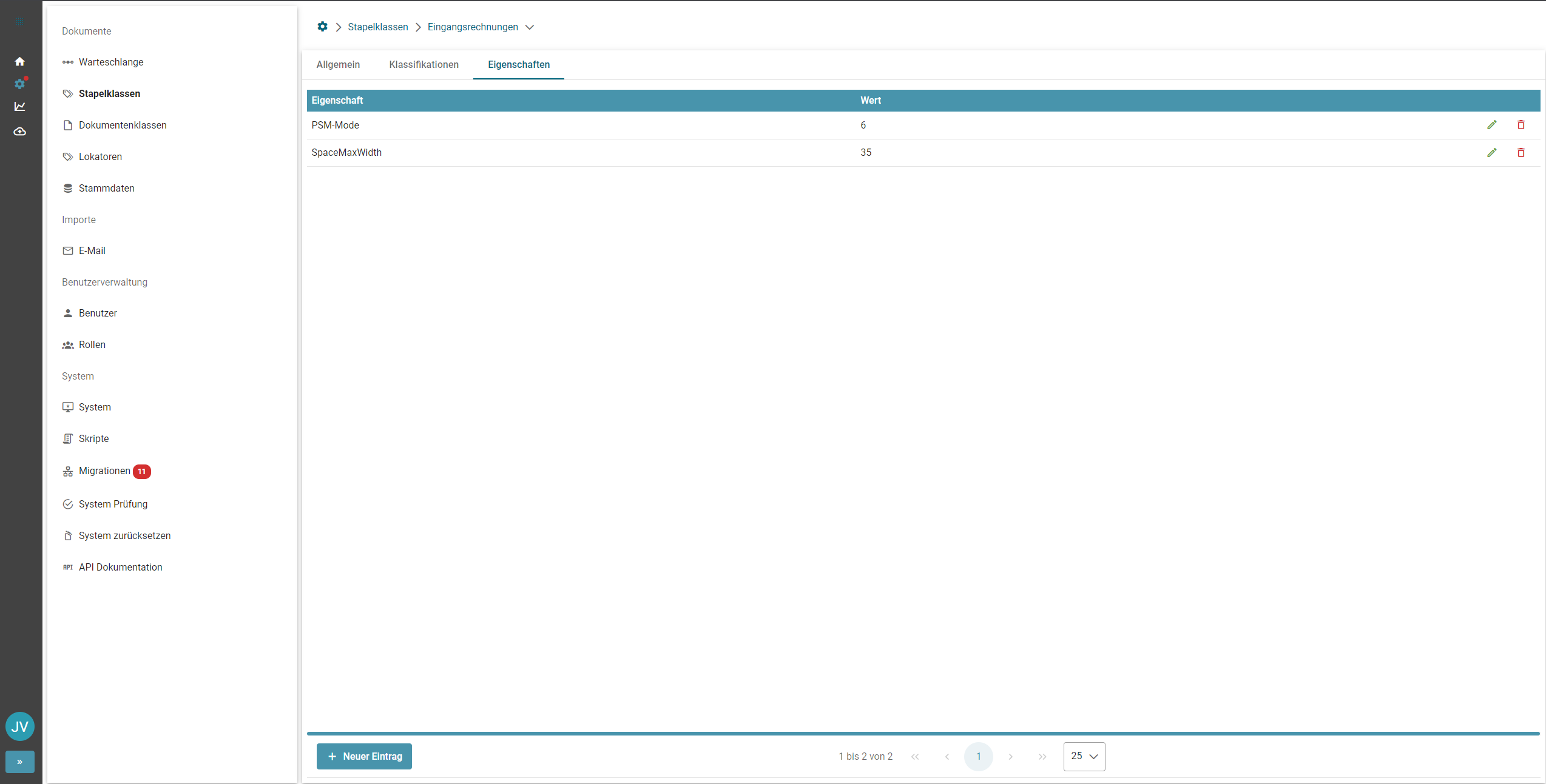 Über das Symbol " Neuer Eintrag" können der Stapelklasse spezifische Eigenschaften hinzugefügt werden.