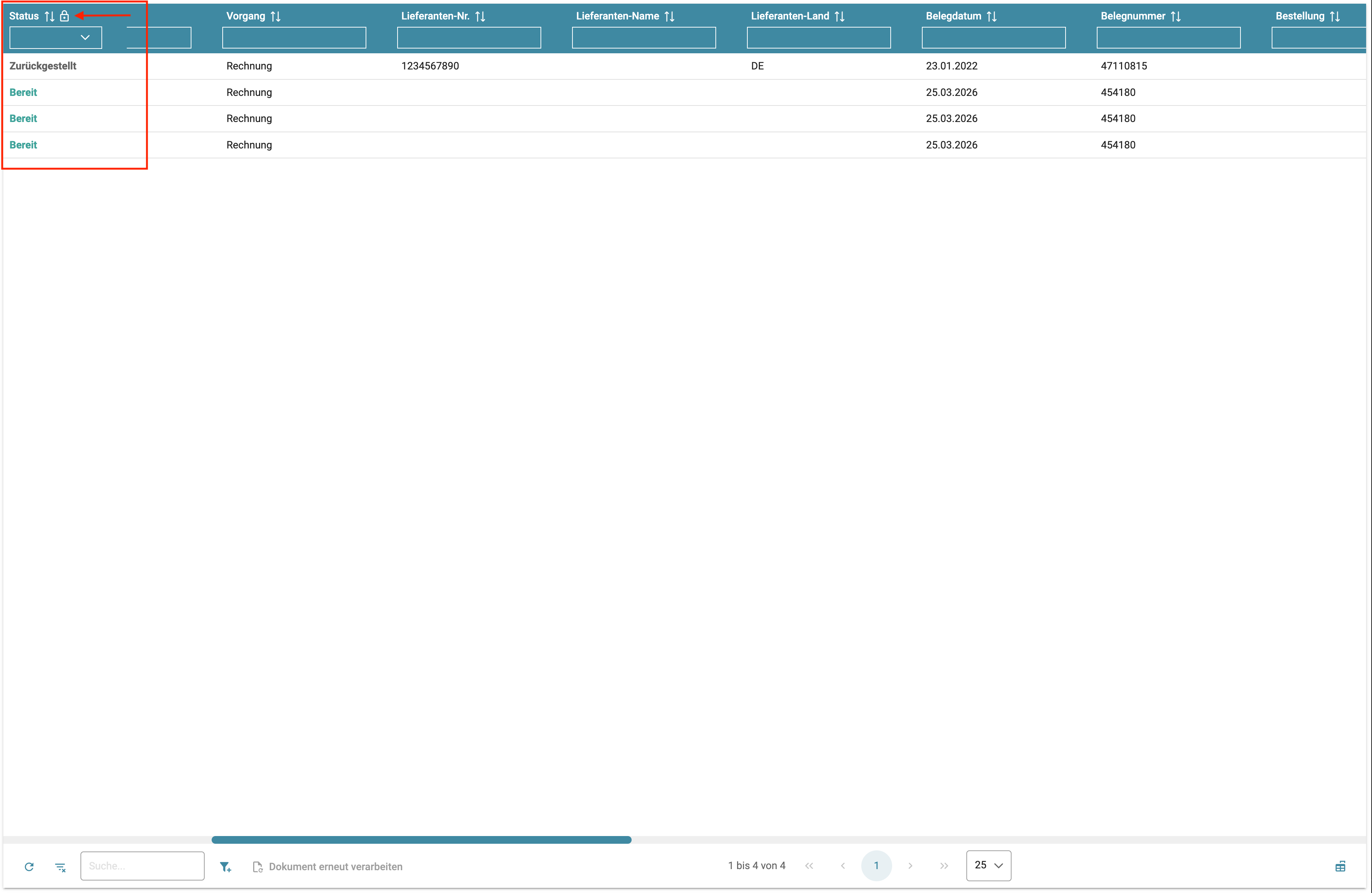 Bestimmte Spalten der Dokumentenliste können links fixiert werden, sodass sie beim horizontalen Scrollen durch die Tabelle sichtbar bleiben.
