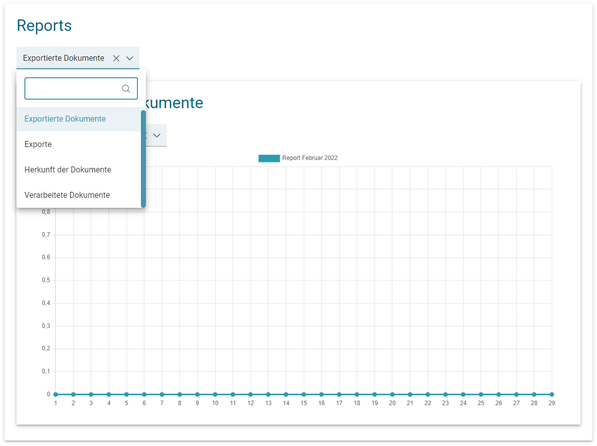 The Reports tile uses a filter (year/month) to display the exported documents, exports, origin of the documents, and processed documents.