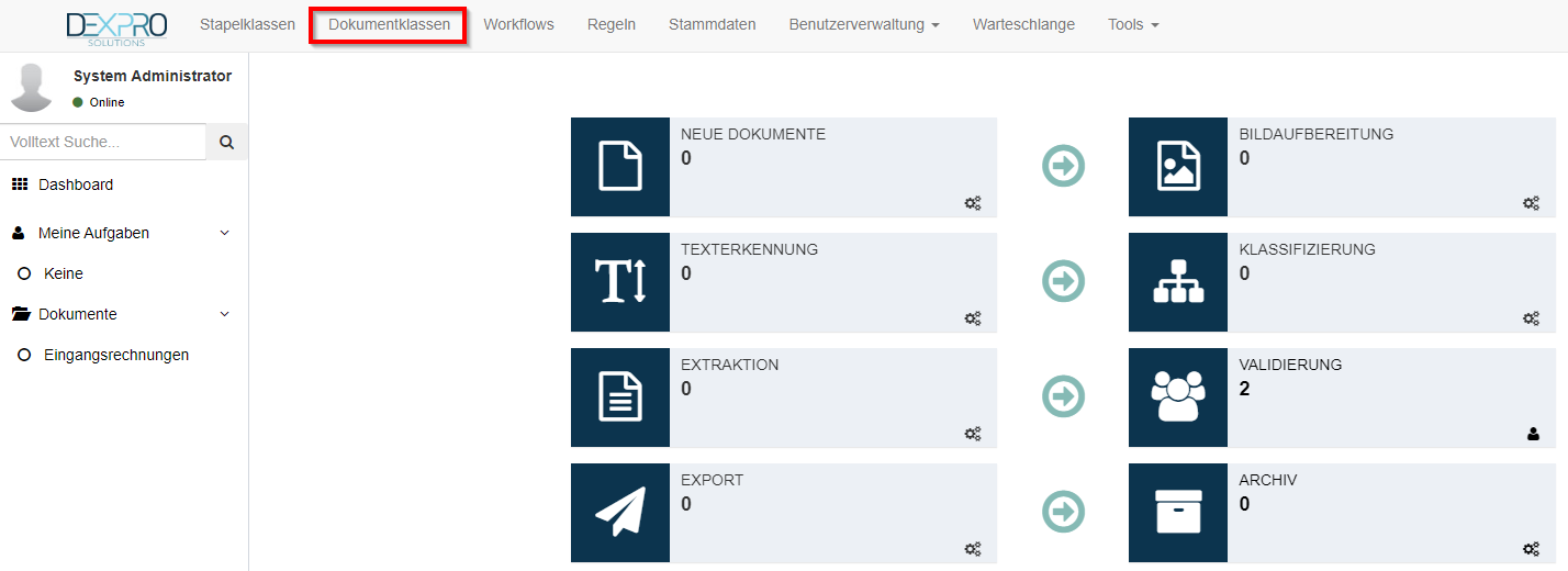 Dokumentenklassen können mit einem Klick auf den Reiter Dokumentenklassen konfiguriert werden