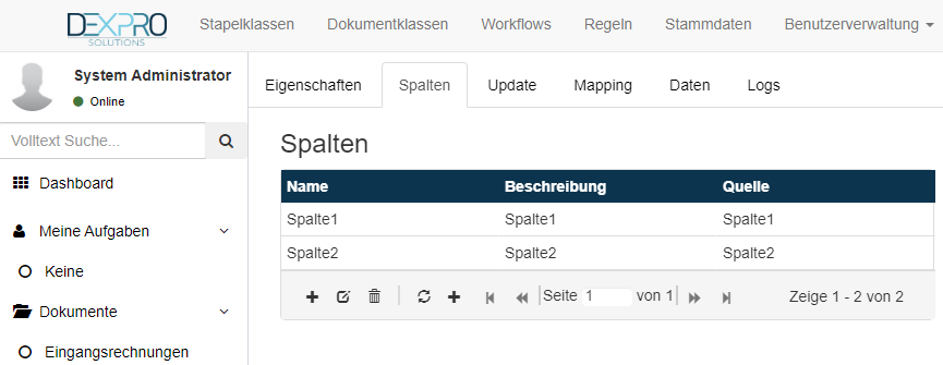 Zuerst werden die Spalten konfiguriert. Beim Klick auf den Reiter Spalten öffnet sich der Dialog zum Konfigurieren der Tabellenspalten.