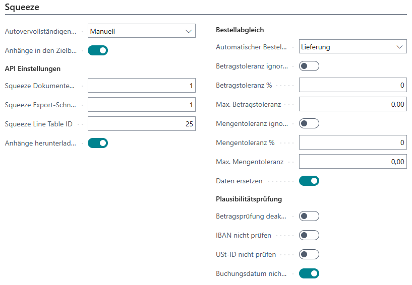 An dieser Stelle wird die der Dokumentenklasse entsprechende ID des verbundenen Squeeze Mandanten hinterlegt sowie die ID der Pull-Export-Schnittstelle, als auch die korrekte LIneLine Table ID. Die Standardwerte stimmen nichtsnicht zwangsläufig mit der Einrichtung im Squeeze Mandanten überein und sollten geprüftgegengeprüft werden.