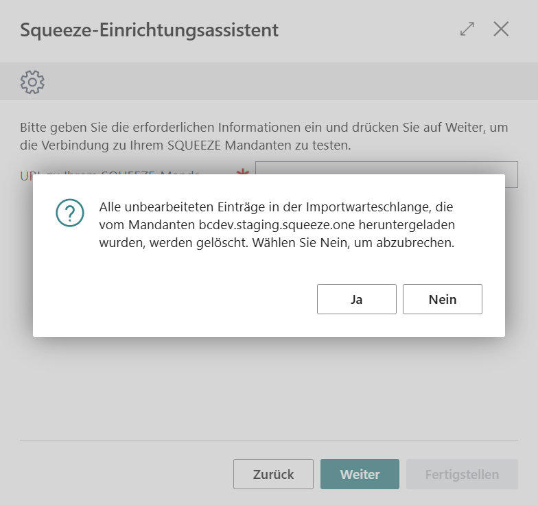 Sollte die abgebildete Meldung erscheinen, so liegen noch unverarbeitete Einträge in der Importwarteschlange vor. Dies kann vorkommen, wenn andere Mandanten bereits mit einem Squeeze verbunden sind. Dies stellt kein Problem dar, da sich diese Belege noch nicht in der Validierung befinden. Diese werden beim nächsten Importlauf automatisch wieder von Squeeze runtergeladen.
