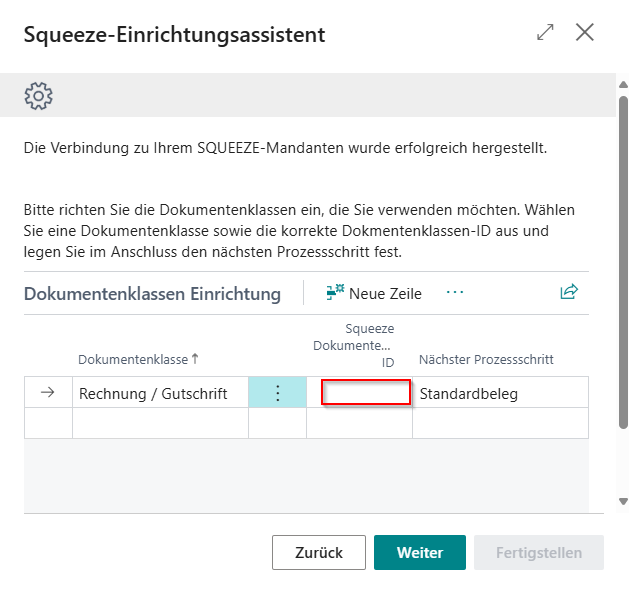 In diesem Schritt wähle Sie die Squeeze Dokumentenklasse aus, welche angebunden werden soll.