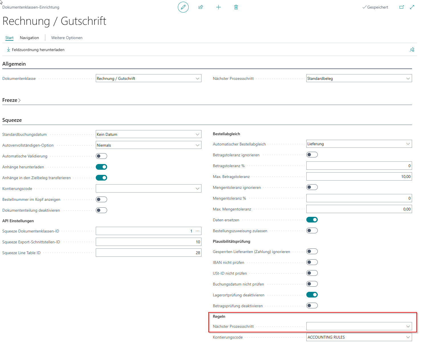 - Stelle sicher, dass in der Dokumentenklasseneinrichtung im Feld „Nächster Prozessschritt“ jetzt der Regelgruppencode