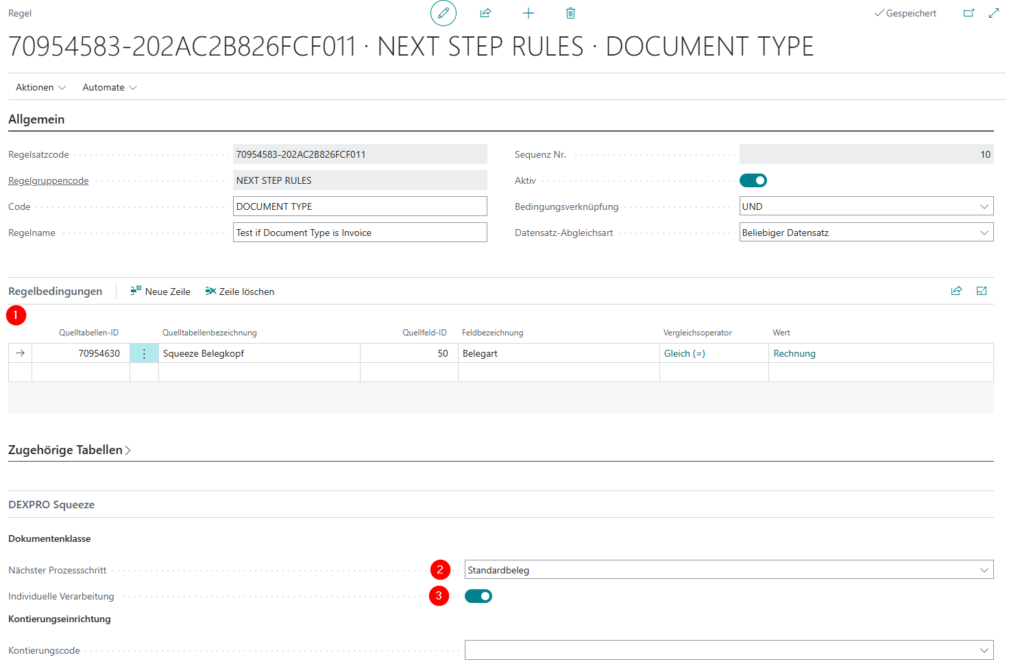 - In der Dokumentenklasseneinrichtung wird ein Regelgruppencode hinterlegt (intern: Feld „DXP Sqz Next Step Rule Group“).