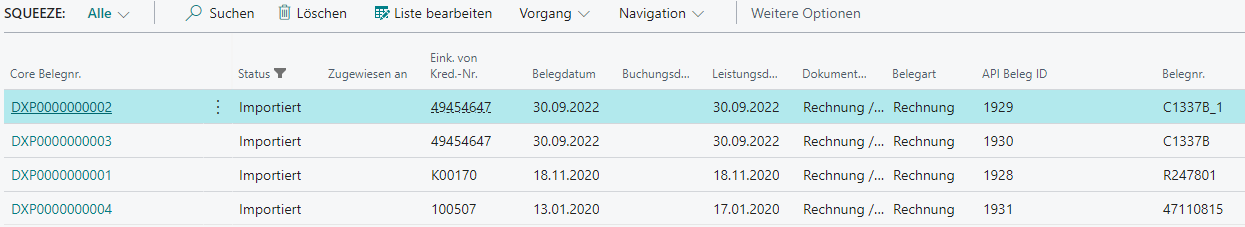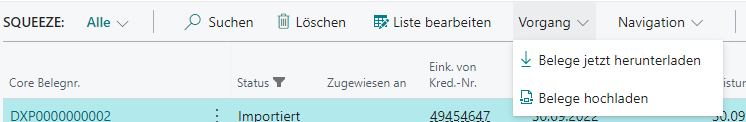 In diesem Menü wird eine Liste von SQUEEZE Belegen angezeigt, die bereit für den Import in die SQUEEZE for BC App sind. Durch das Ändern des Systemfilters ist es ebenfalls möglich, bereits importierte Belege einzusehen.