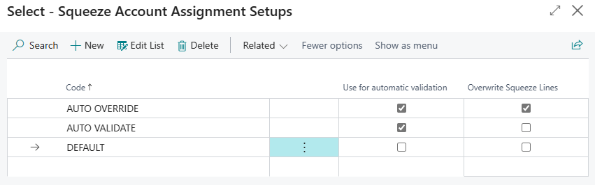 For automatic validation, you can additionally activate that all squeeze lines of a document are overwritten with the configured account assignment setup lines. ("Overwrite squeeze lines" checkbox).