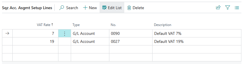 When importing a document from Squeeze, the recognized VAT. records are checked against the setup lines of the stored account assignment setup. If matching entries are found, a check is made to determine whether lines with the stored account assignments may be created. In the standard case, this is only done if Squeeze does not supply any items.