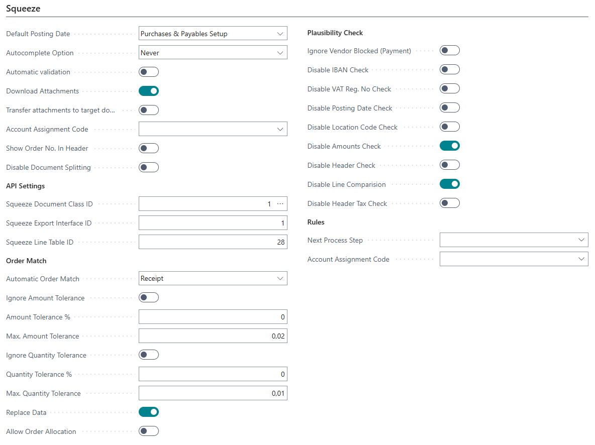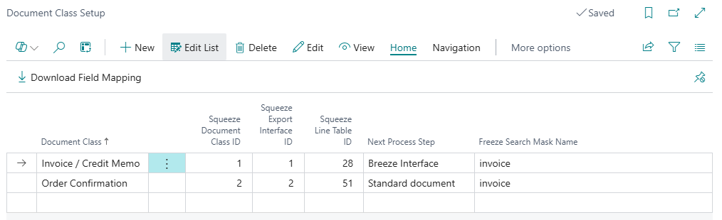 In the SQUEEZE document class setup, the mapping between the respective document class and your export interface is done. Furthermore, the field mapping of each document class is downloaded here, creating a set of standard fields and their usage in Microsoft Dynamics 365 Business Central.