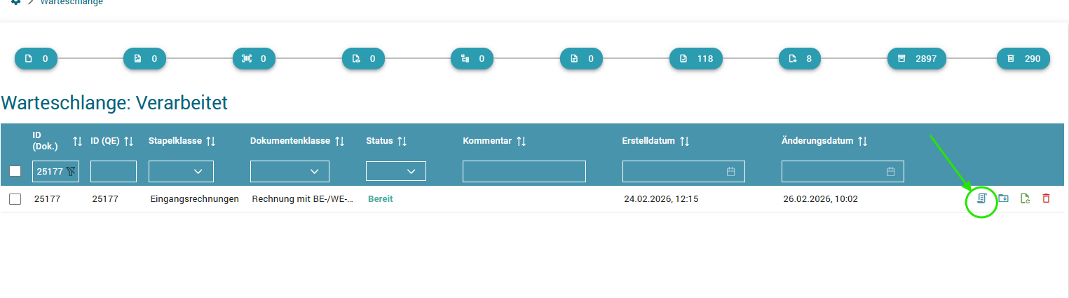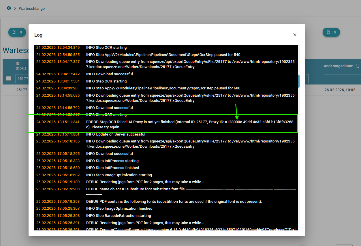 Warteschlange | Verarbeitet: AI Proxy is not yet finished / Beleg / Dokument im Proxy neu verarbeiten / anstoßen