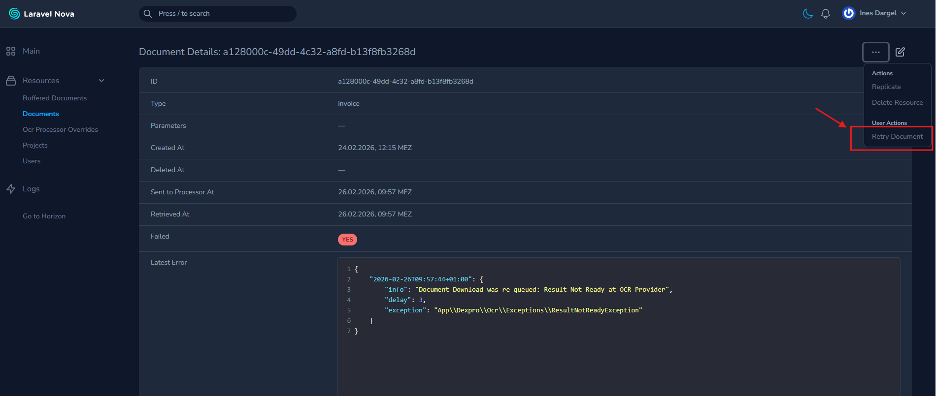 3. Klicke auf die ID, dann auf die "..." rechts oben in der Ecke und führe "Retry Document" aus